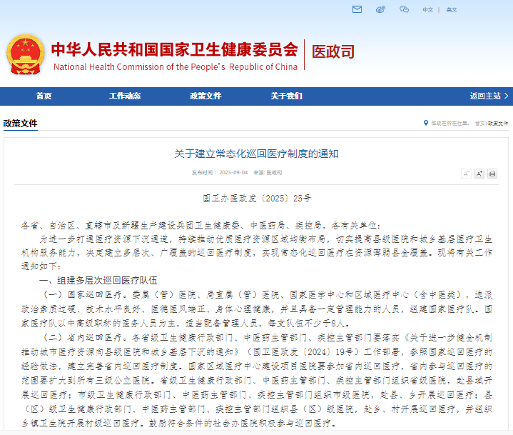 每季度、鄉(xiāng)村級(jí)每月”開(kāi)展一次巡回醫(yī)療,并要求 2025 年 10 月底前實(shí)現(xiàn)資源薄弱縣全覆蓋。